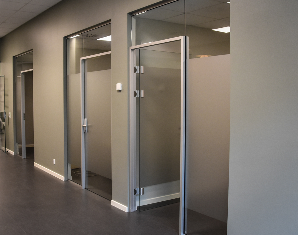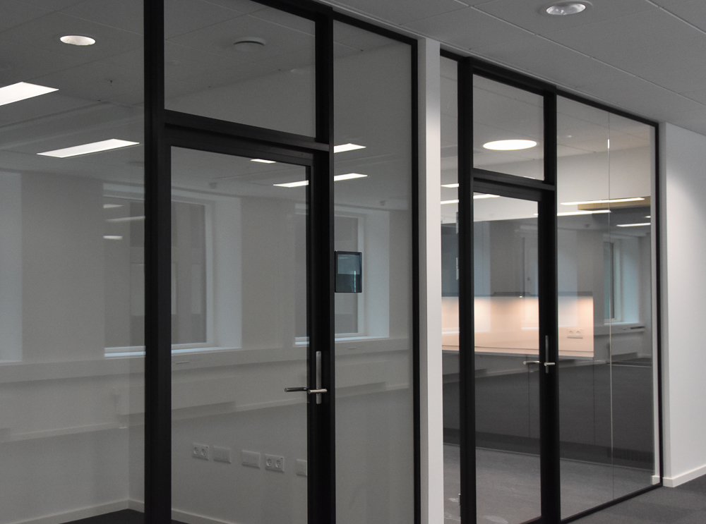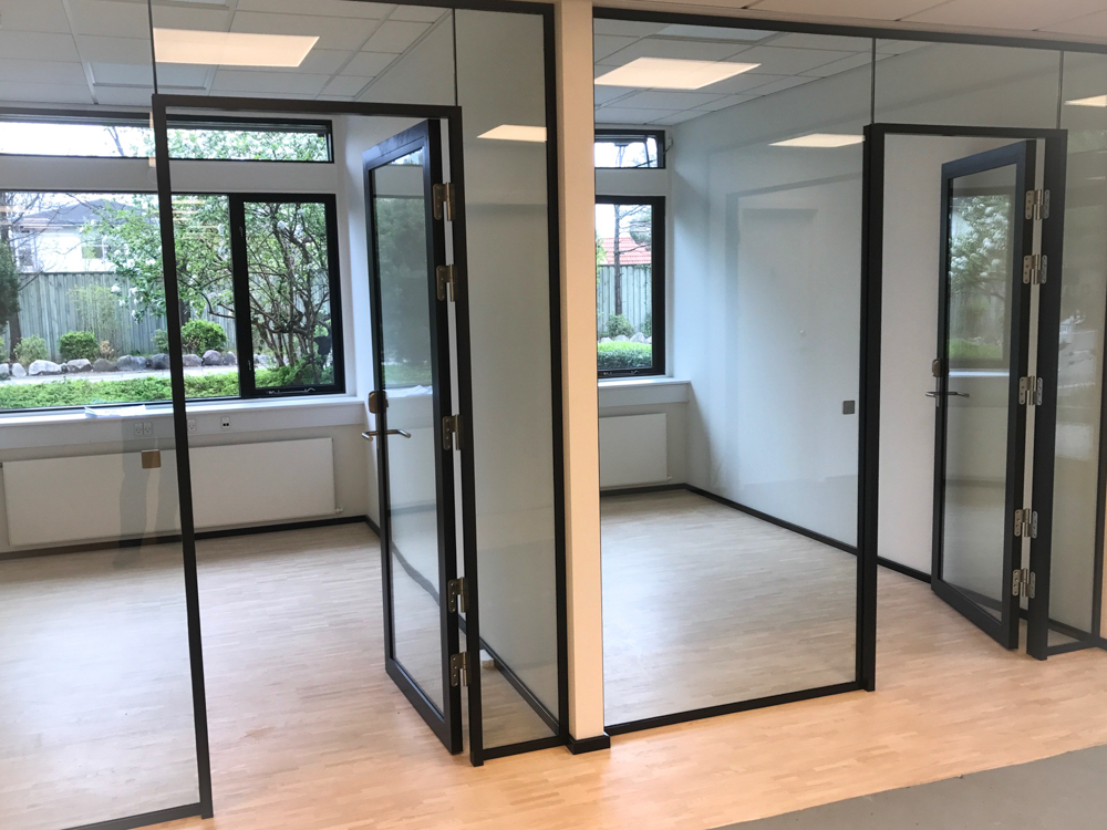 I forbindelse med en stor renovering af en kontorejendom på Lautrupvang i Ballerup er kontorer indrettet med glasvægge og glasdøre - Læs mere om renoveringen her