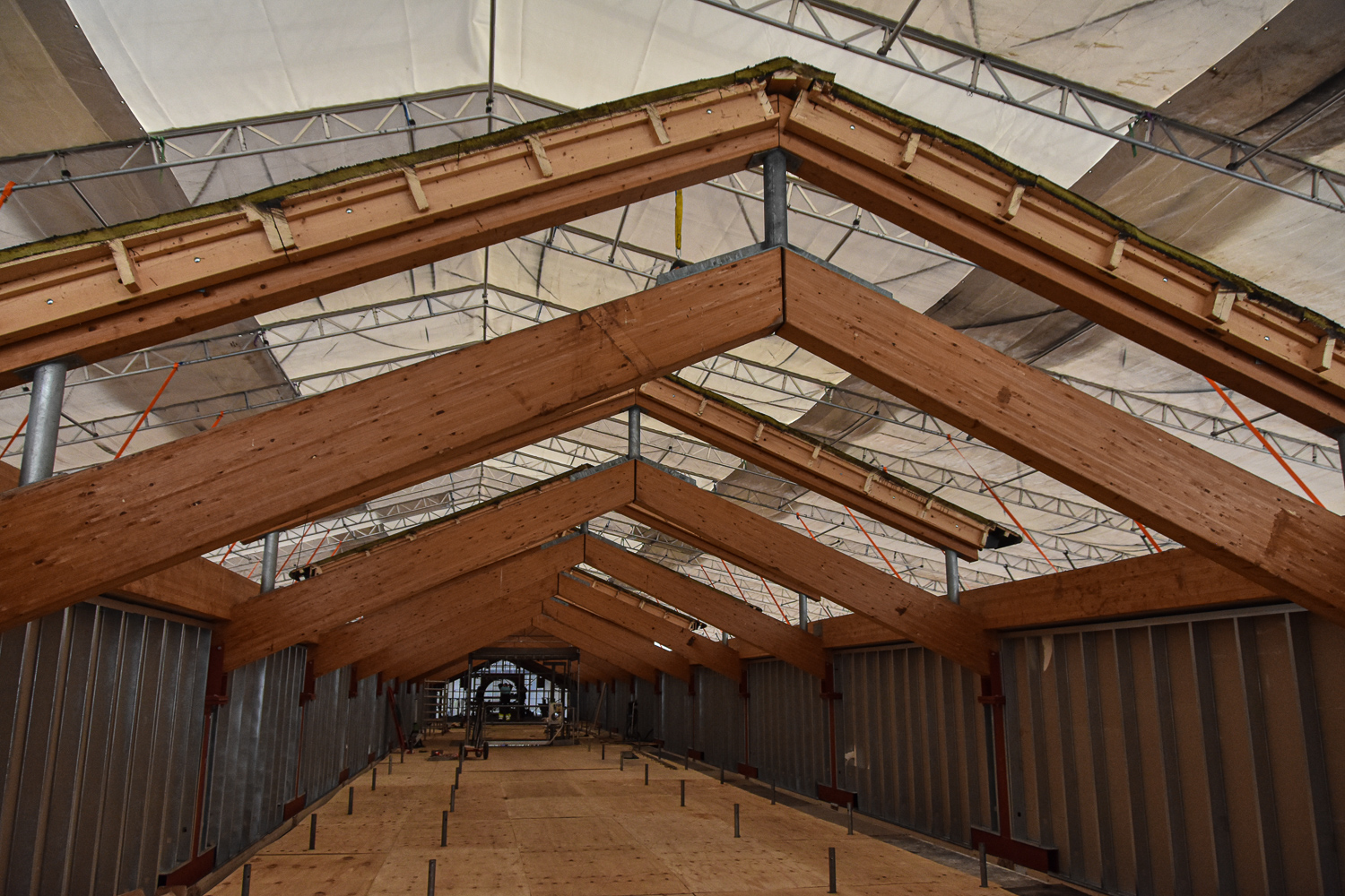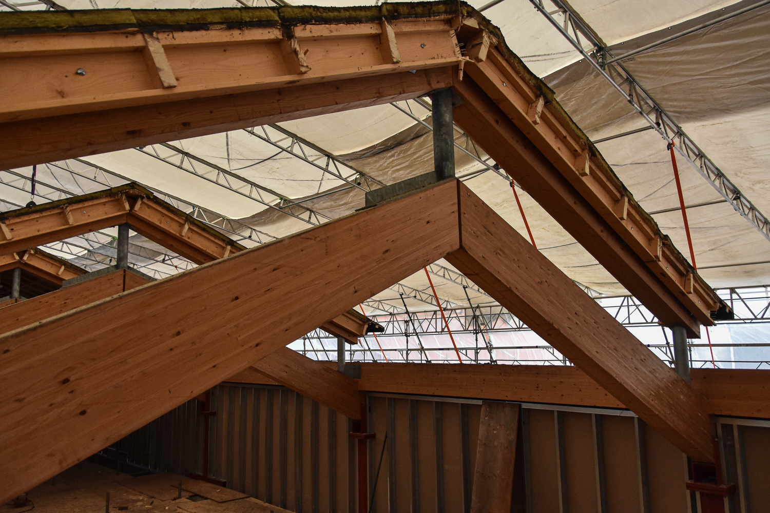 I den nye tagkonstruktion er de oprindelige tagspær bevaret, mens selve taget er udskiftet med tagkassetter, udført af bgb på stedet. Konstruktionen består af 52 tagkasetter og tagfod udført i spærtræ.