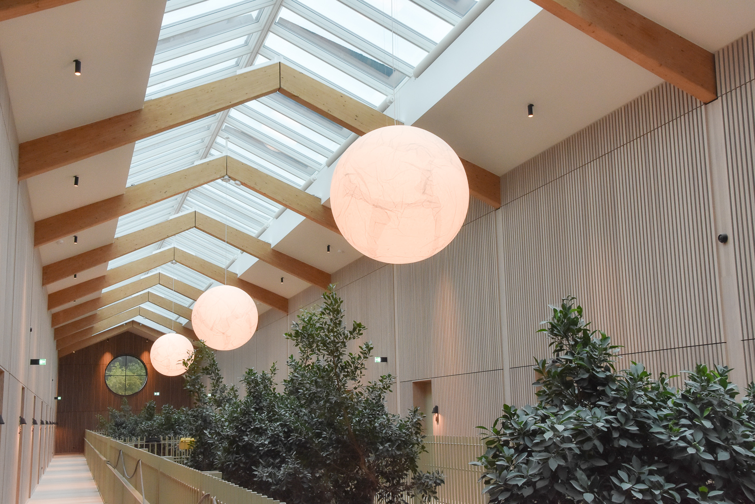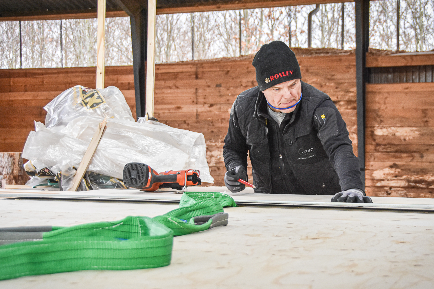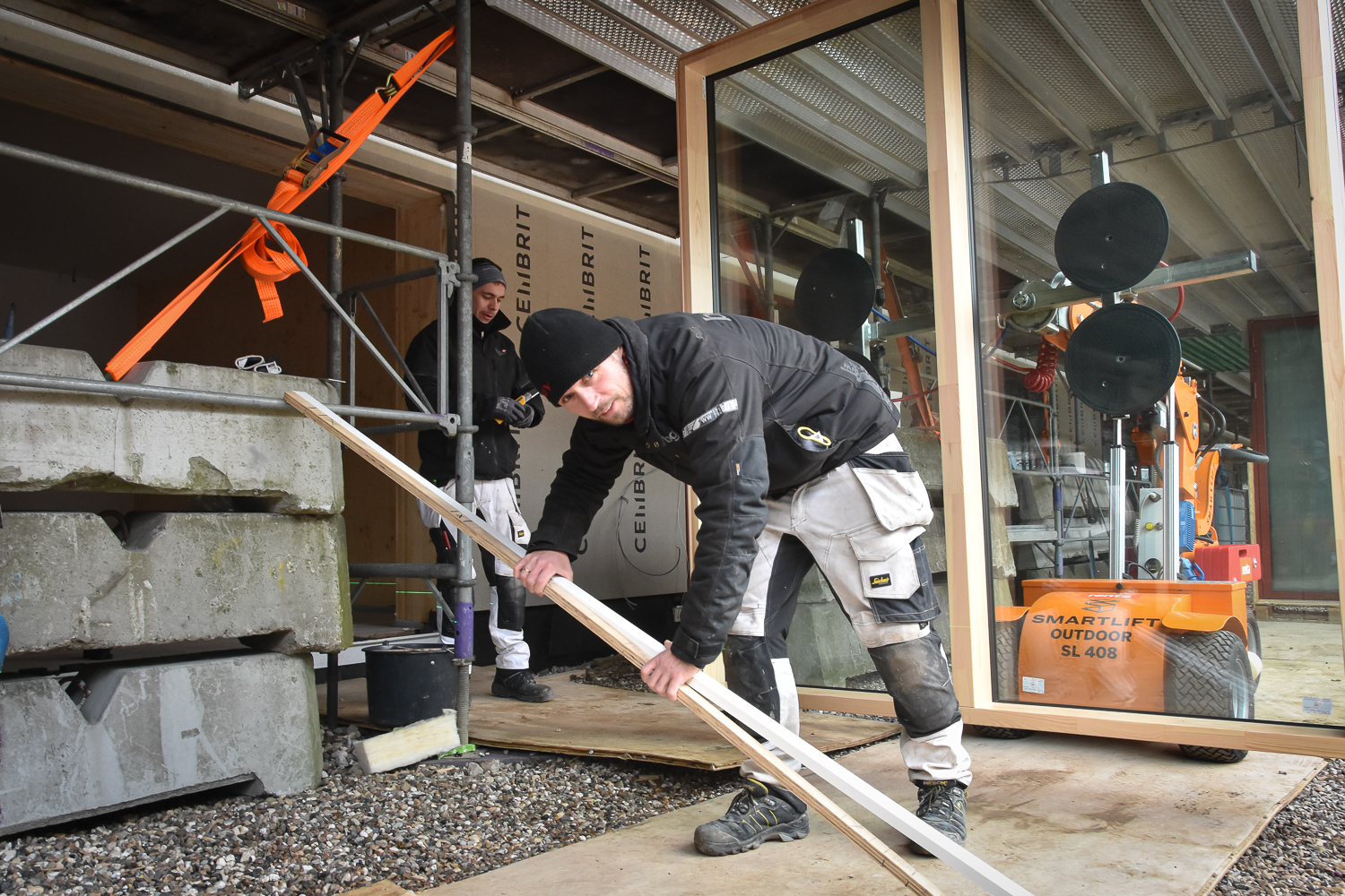 Indvendige vægge og dækadskillelse i den ombyggede ridehal er udført i CLT-elementer, dvs krydslamineret massivtræ, hvilket betyder, at der har været store krav til gipsarbejdet, som er udført af bgb.