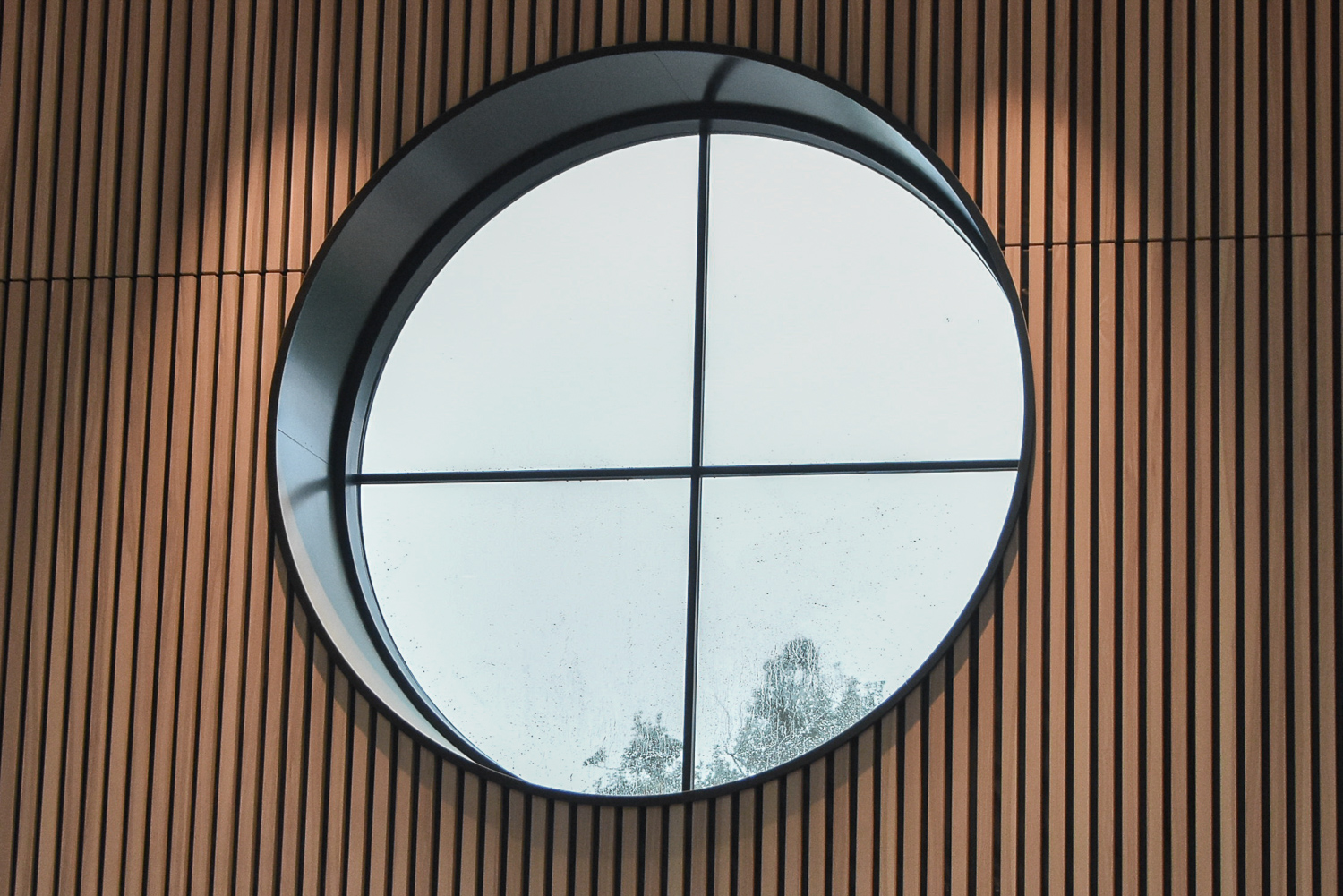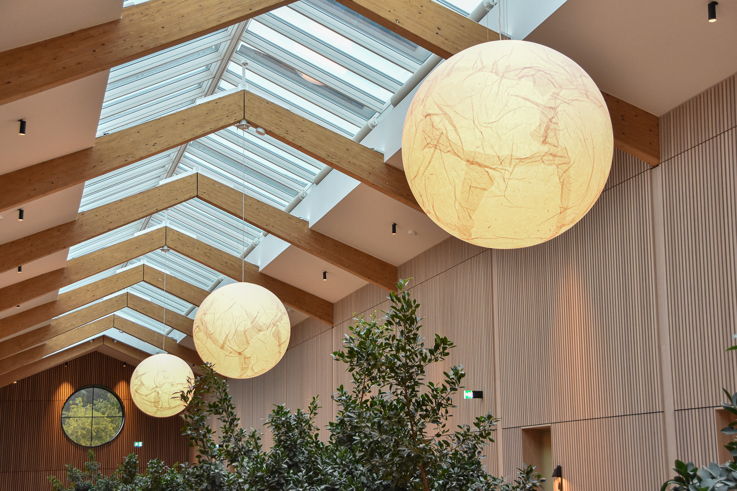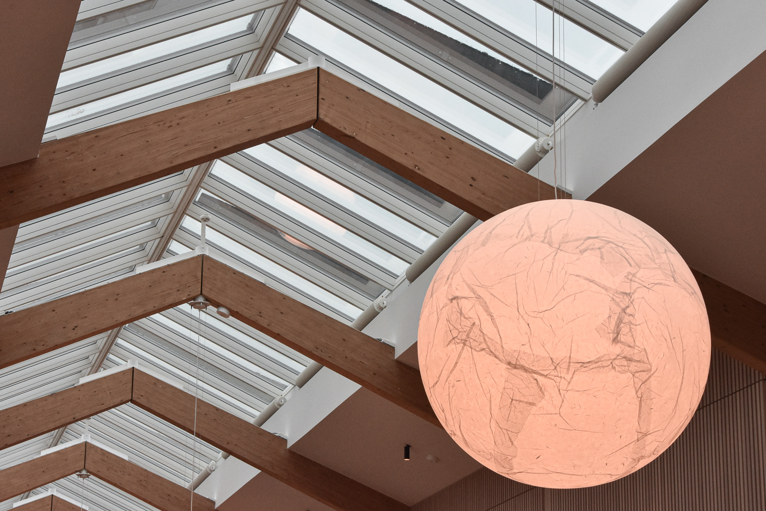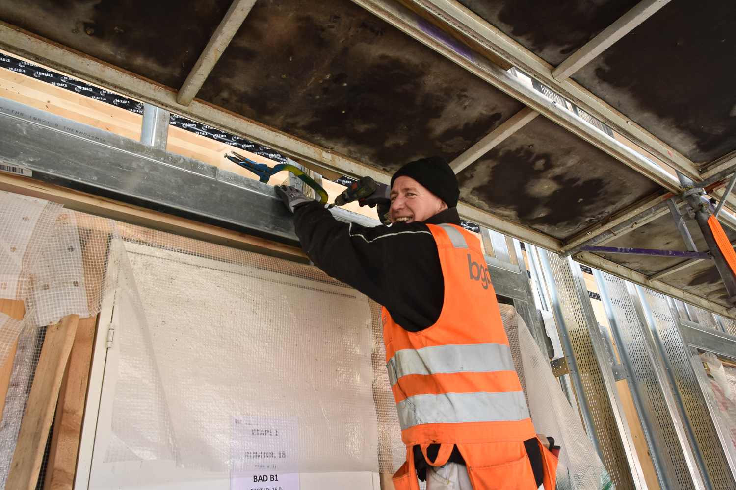 Indvendige vægge og dækadskillelse i den ombyggede ridehal er udført i CLT-elementer, dvs krydslamineret massivtræ, hvilket betyder, at der har været store krav til gipsarbejdet, som er udført af bgb.