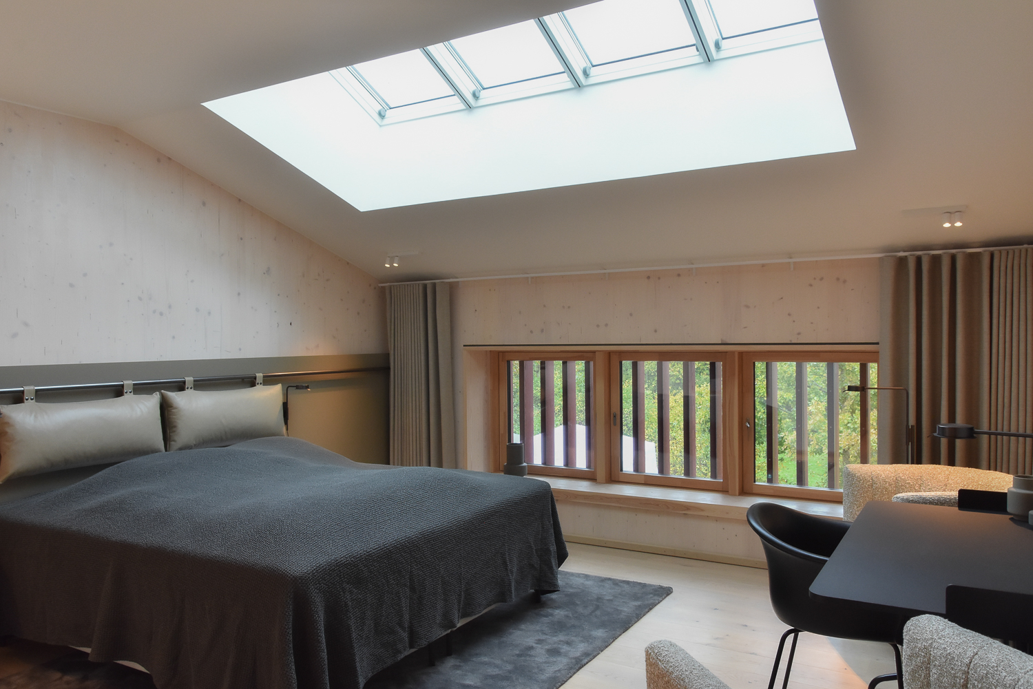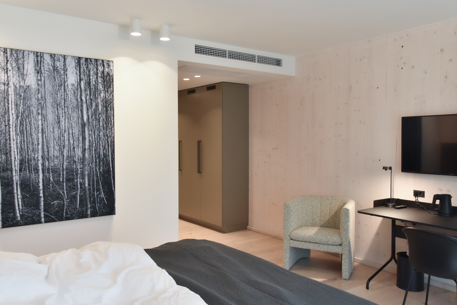 Hotelværelserne er bygget op i en helt tom bygning, hvor kun ydervæggene og et betondæk var tilbage. Dette arbejde har krævet særligt tilpassede løsninger, udviklet af vores erfarne medarbejdere, for at kunne etablere de unikke værelser i den gamle bygning.