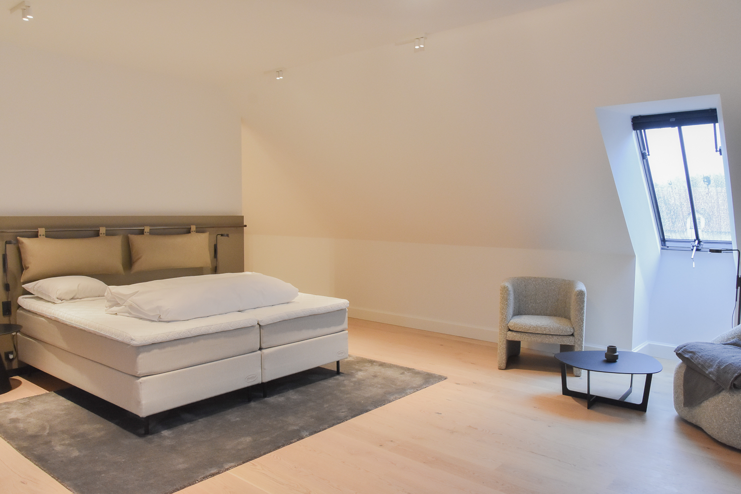 I en tidligere hestestald er indrettet 17 nye hotelværelser i to etager. Her har bgb lavet lofter, snedkerarbejder og gipsvægge.
