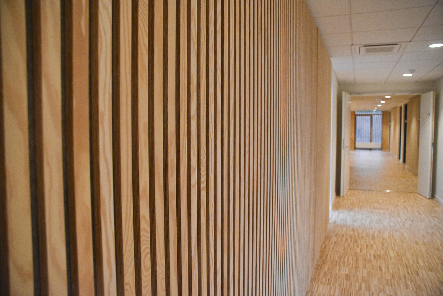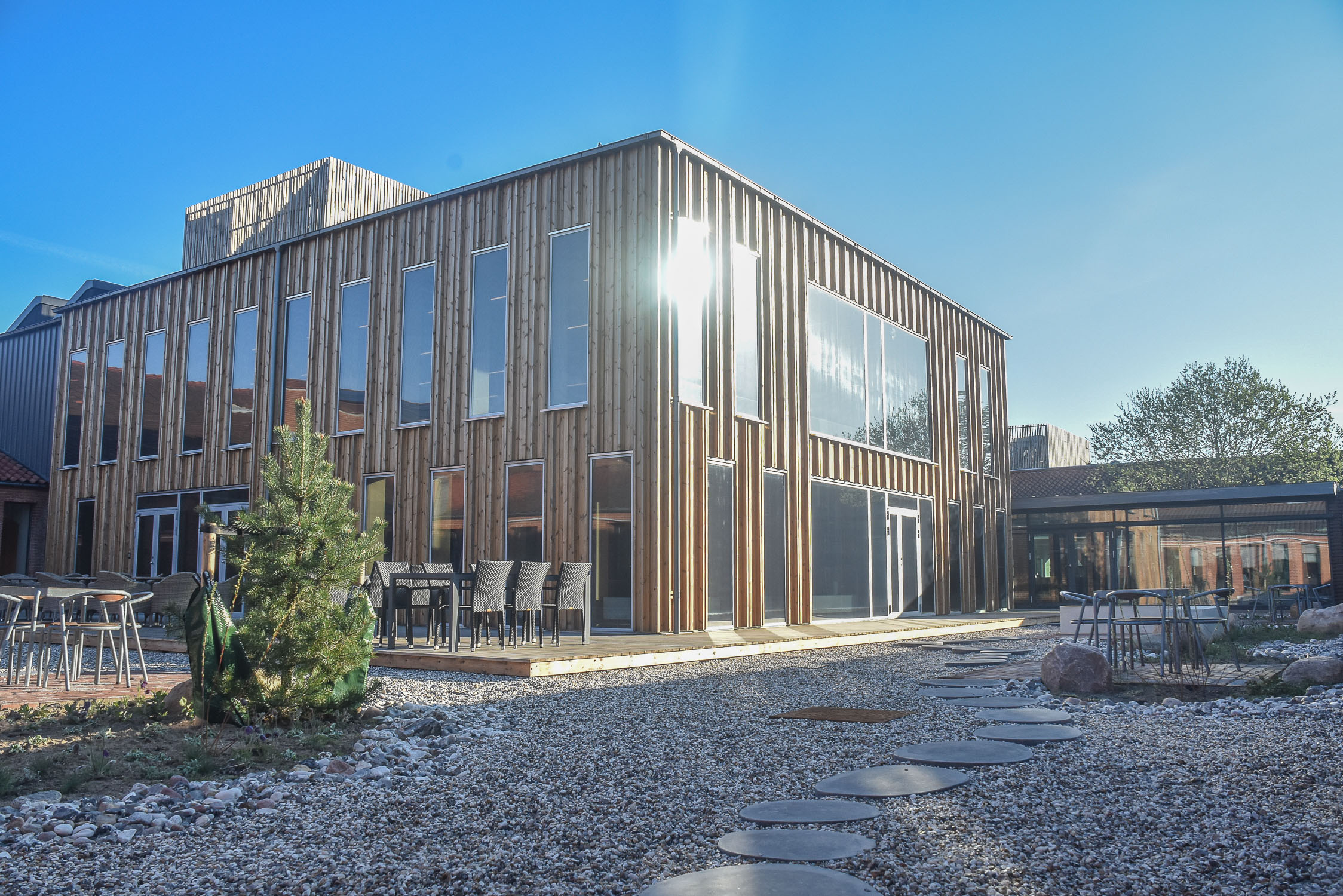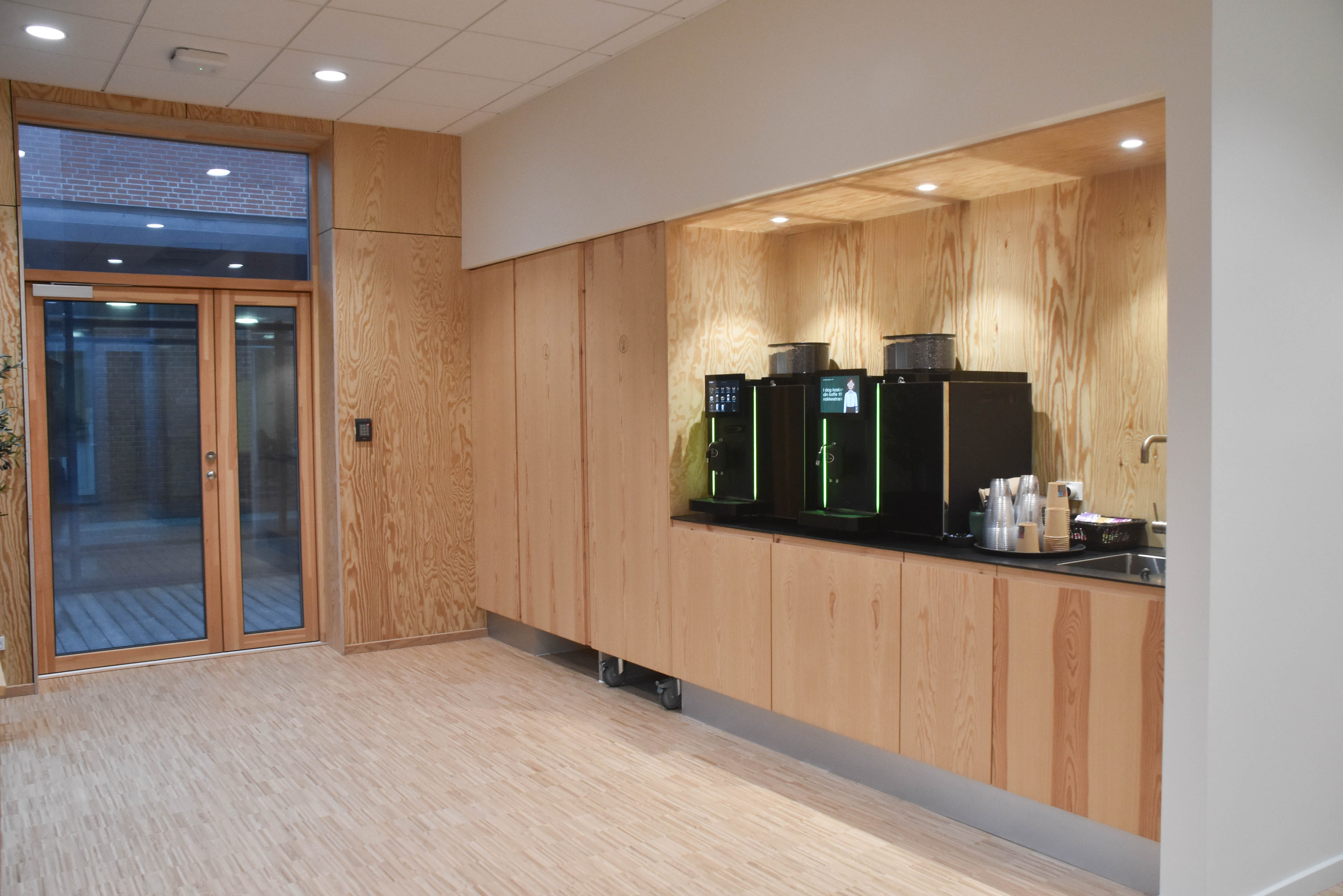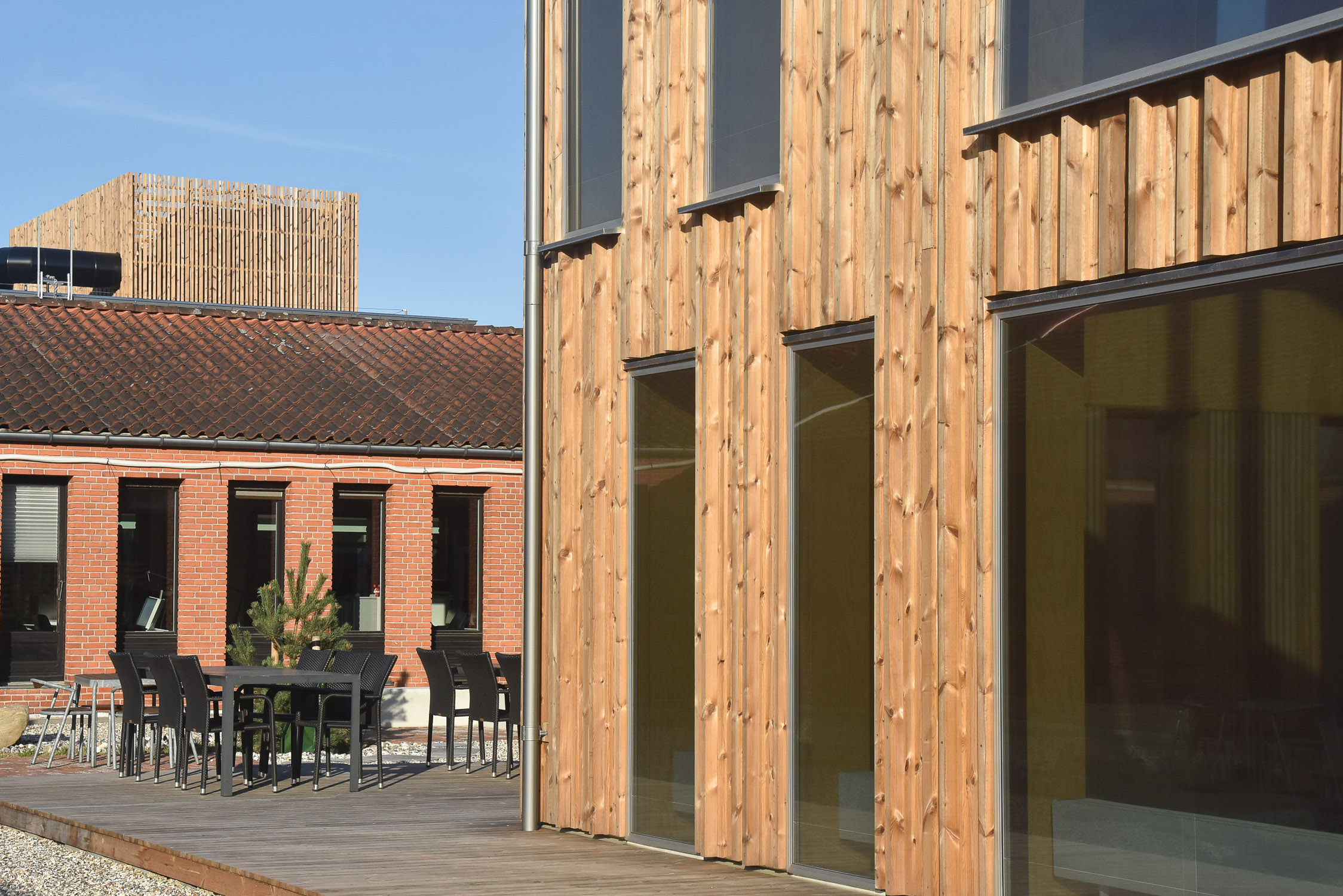 De fem nye bygninger er opført med bærende konstruktioner, facader og tag i træ, mens beton udelukkende er anvendt i terrændækket. Indvendigt går træet igen i form af trælamellofter, akustikvægge, krydsfinerbeklædninger og snedkerkøkkener. Flere af snedkerelementerne er produceret på bgb’s eget snedkerværksted, Multika Snedkerier. I det nye receptionsområde har vi desuden leveret et receptionsmøbel i genbrugstræ.