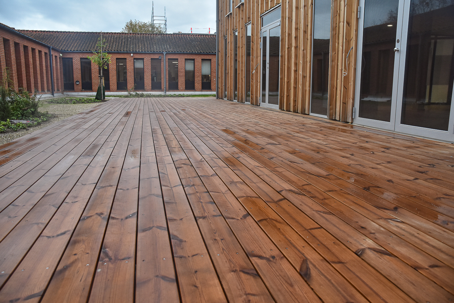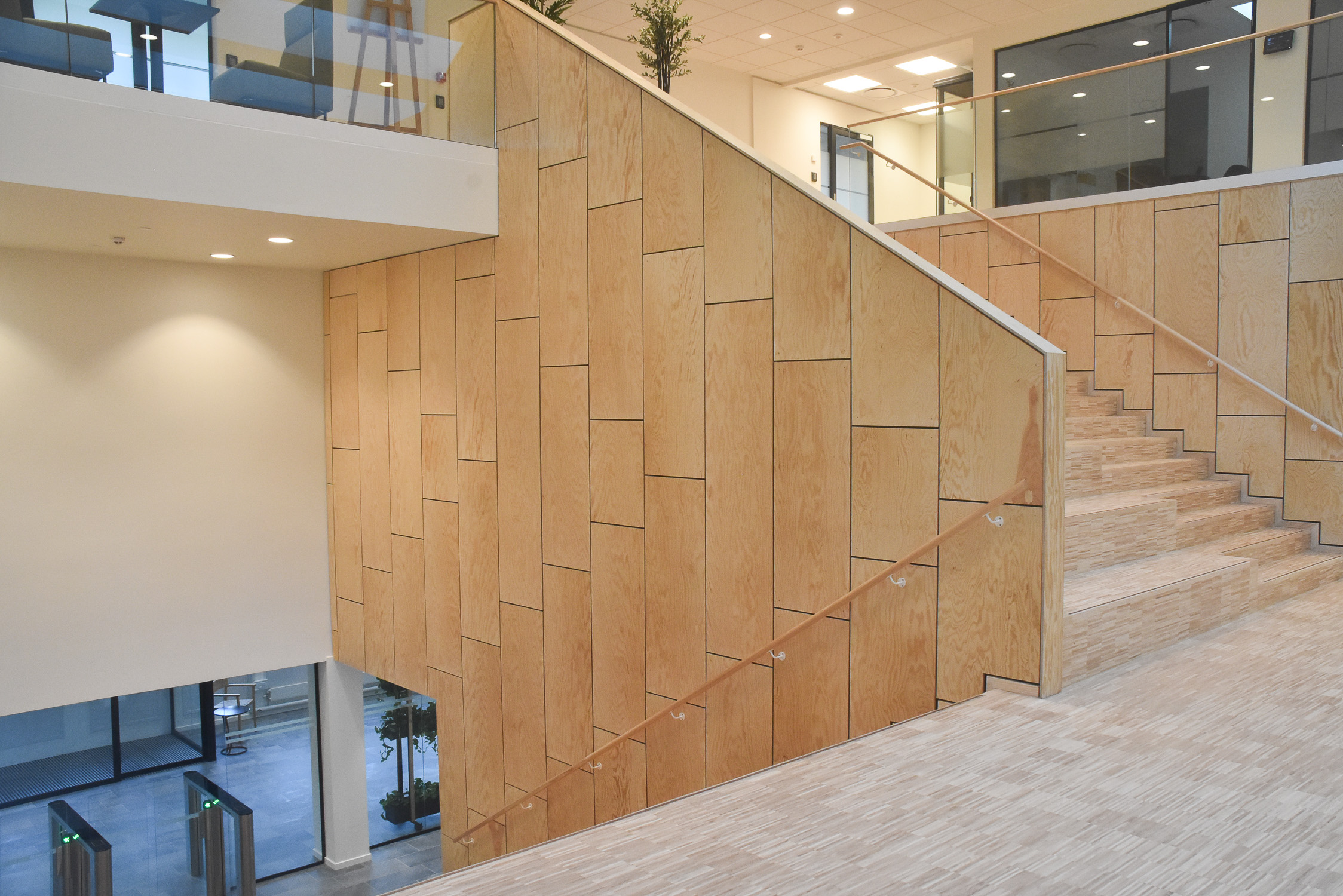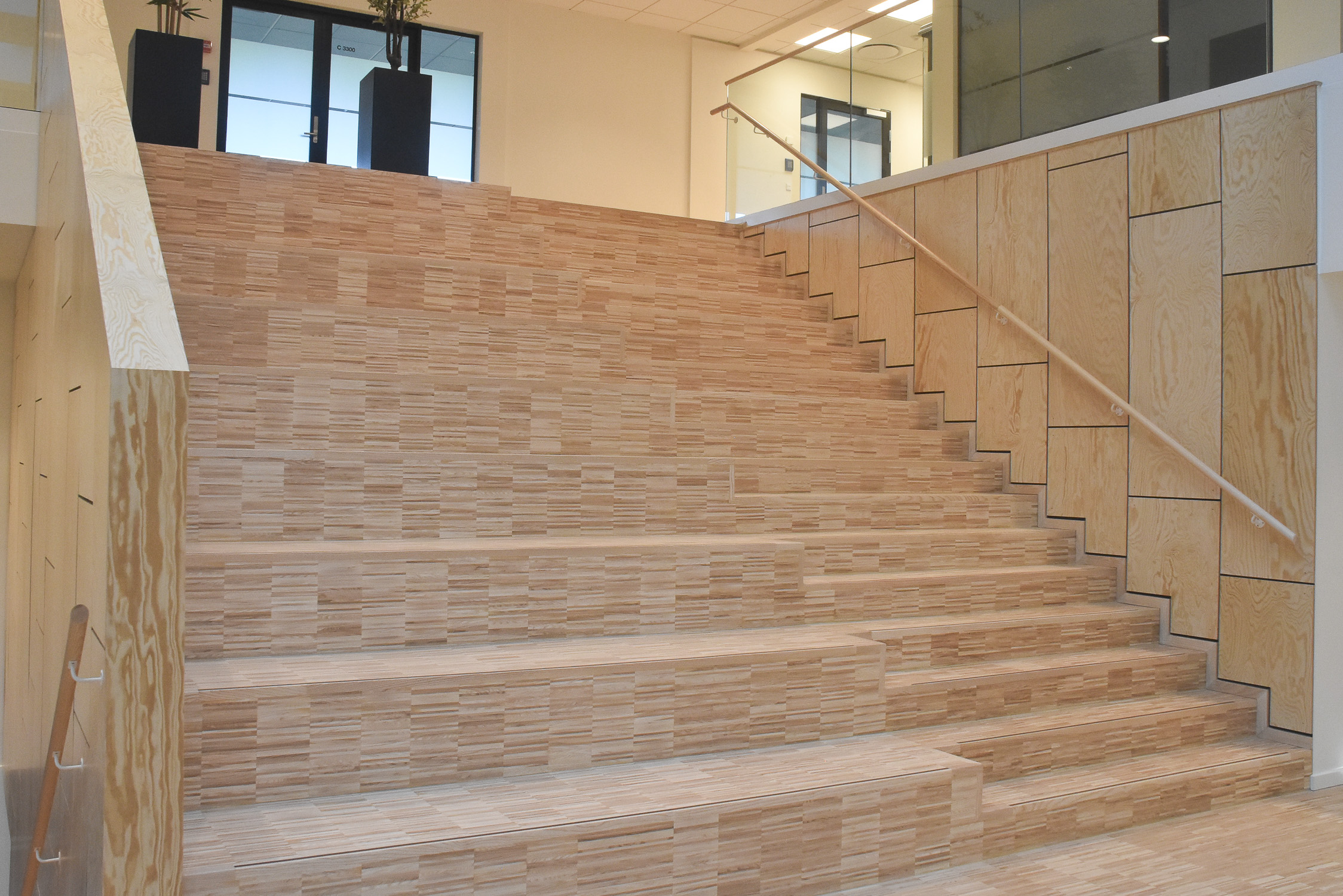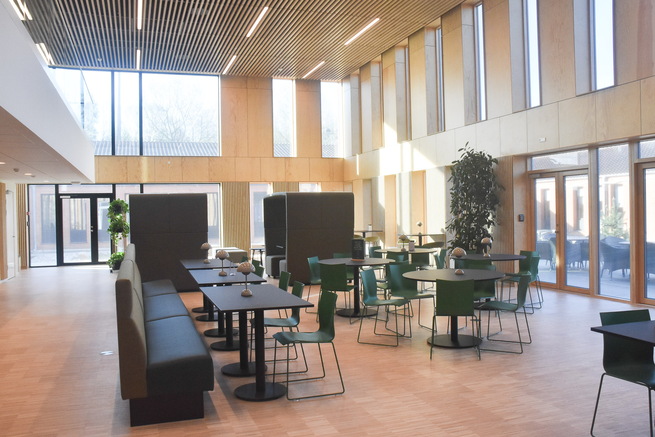 De fem nye bygninger er opført med bærende konstruktioner, facader og tag i træ, mens beton udelukkende er anvendt i terrændækket. Indvendigt går træet igen i form af trælamellofter, akustikvægge, krydsfinerbeklædninger og snedkerkøkkener. Flere af snedkerelementerne er produceret på bgb’s eget snedkerværksted, Multika Snedkerier. I det nye receptionsområde har vi desuden leveret et receptionsmøbel i genbrugstræ.