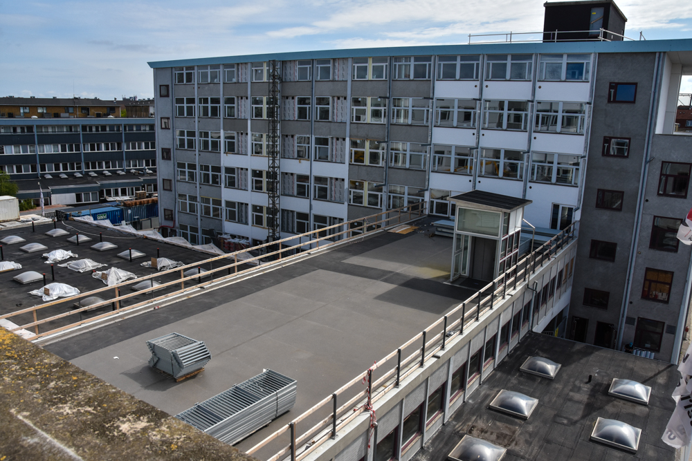 bgb har også etableret to træterrasser på ejendommen. Entreprisen rummede desuden vinduesmontering, ligesom vi andre steder demonterede vinduer og lukkede facaden med Rockpanel facadeplader.