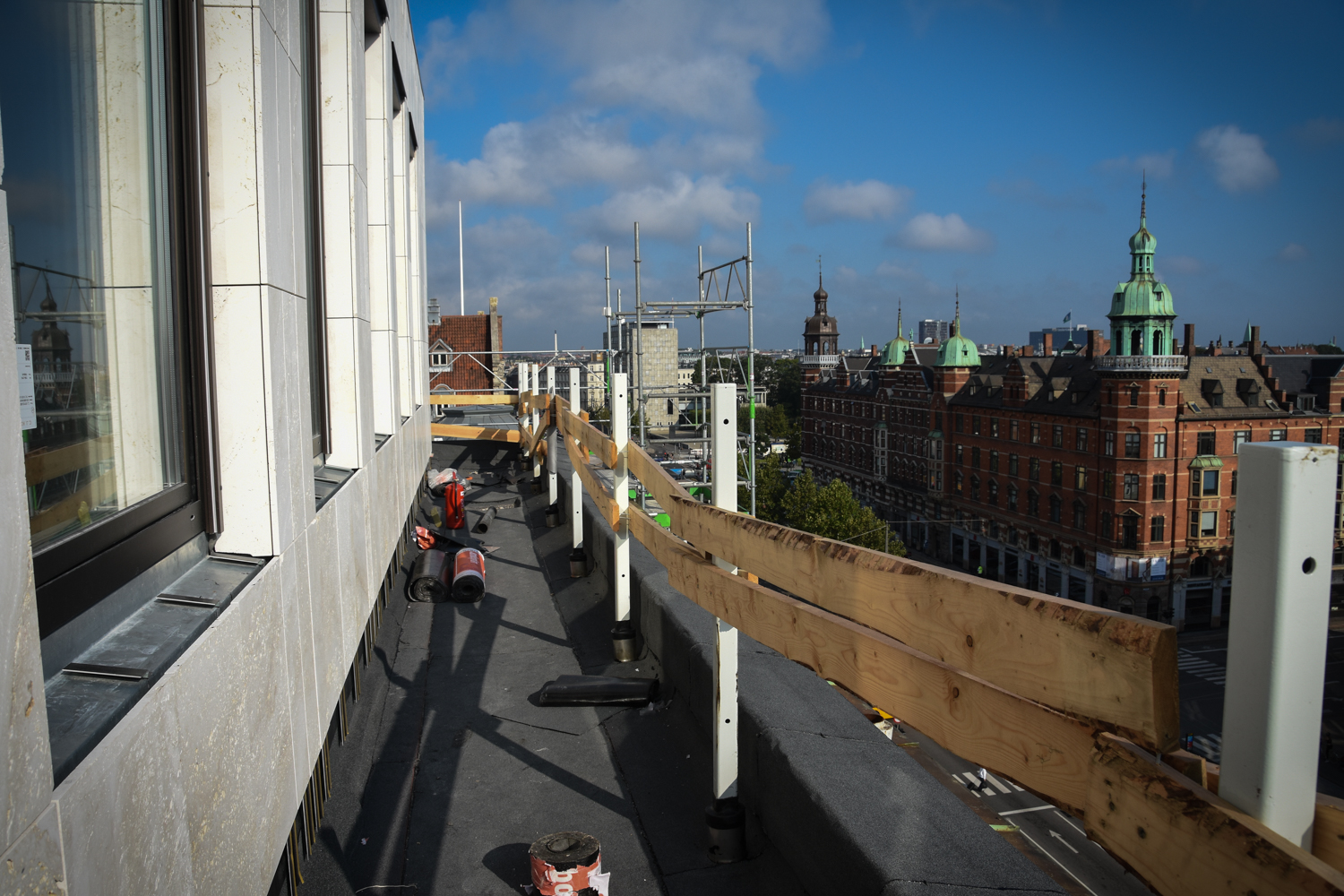 Der er etableret en ny 7. etage på ejendommens tag, hvor der er indrettet reception, skybar, lounge og mødelokaler. bgb a.s. varetog tømrer-snedkerarbejdet på etagen, og vi byggede også en træterrasse langs hele etagen ud mod Rådhuspladsen.