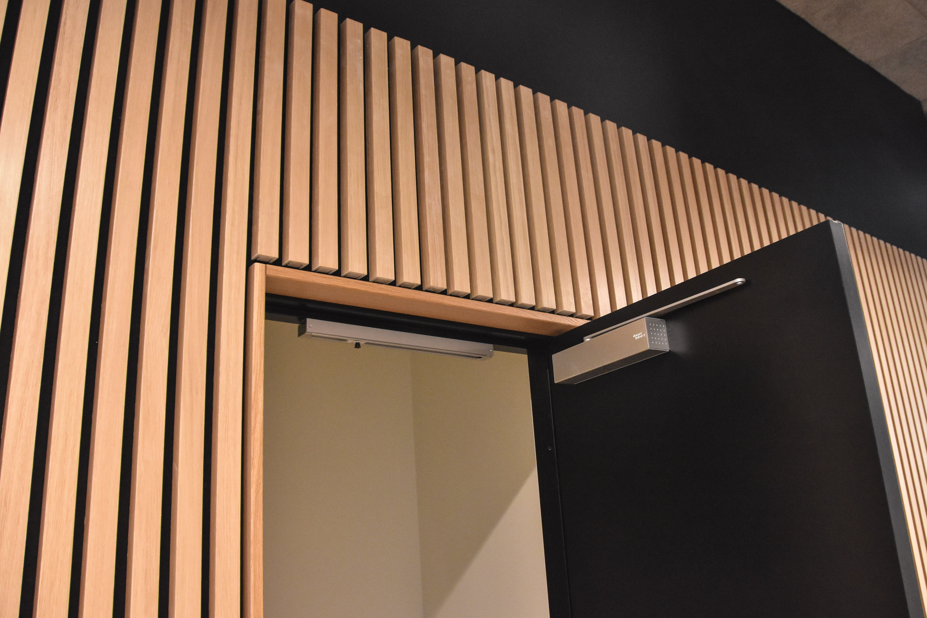 De anvendte døre er pladedøre i aluminiumskarm. Karme og skinner er malet i RAL 9005.