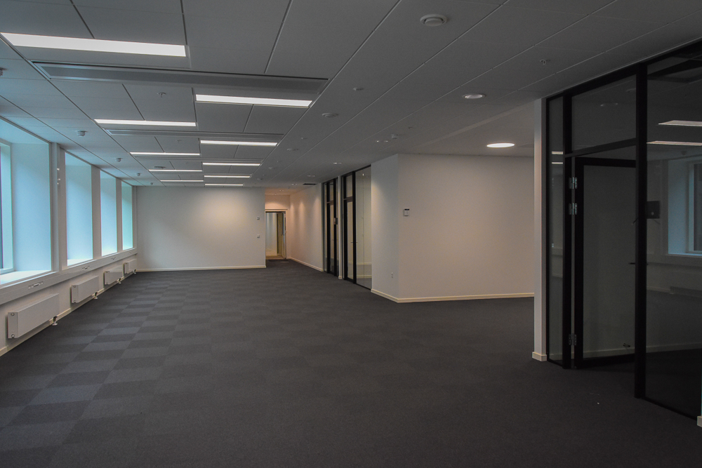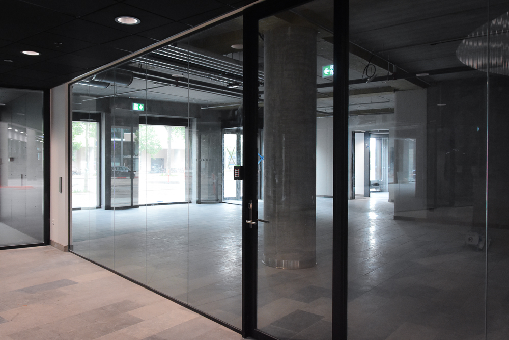 Her er både brugt glasløsninger i klassiske størrelser til indretning af mødelokaler på ejendommens etager, og glasvægge- og døre i unikke størrelser til ejendommens stueetage, som er indrettet med glasløsninger på op til 4,20 meter i 16 mm lydglas.