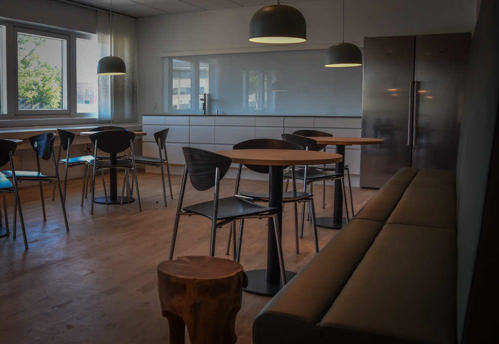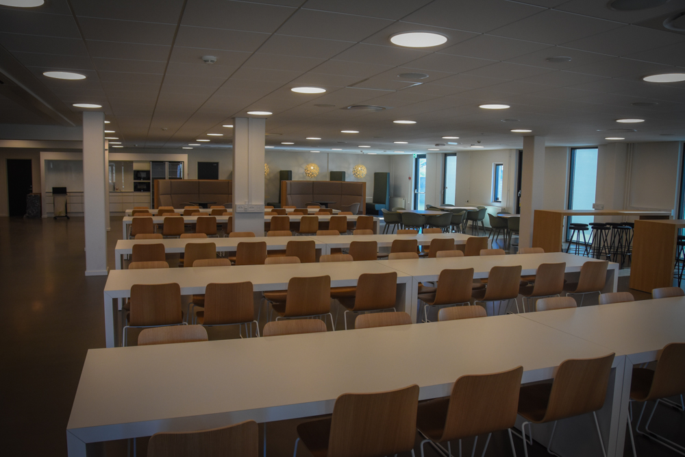 Også i parterre er kantinens anretterkøkken renoveret. Anretterkøkkenet har direkte adgang til storkøkkenet i stueetagen, som også er renoveret. Kantinen i parterreetagen, som servicerer de 800 medarbejdere, er ombygget for at sikre et godt flow til og fra kantinen, ligesom der er etableret en udendørs terrasse med borde og stole i forbindelse med kantinen.