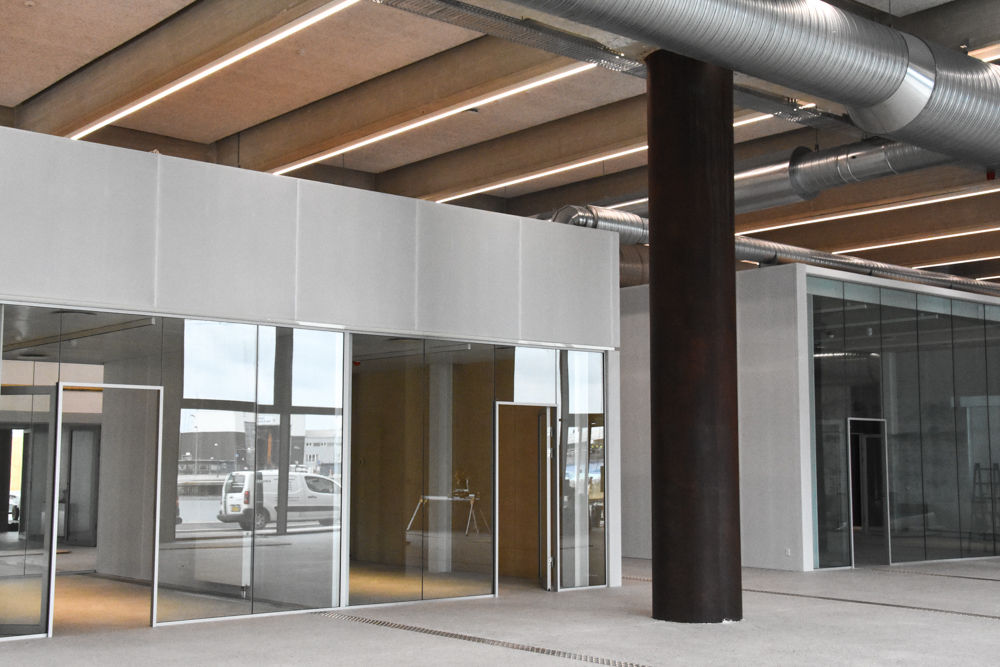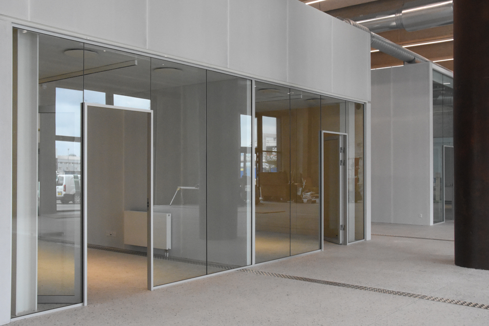 bgb a.s. har bygget de fire mødebokse, som er opbygget med en stålkonstruktion beklædt med finérplader, og husene er desuden forsynet med ståltag. Vi har også udført lofter, gipsvægge, og bgb design glasvægge i denne del af ejendommen.