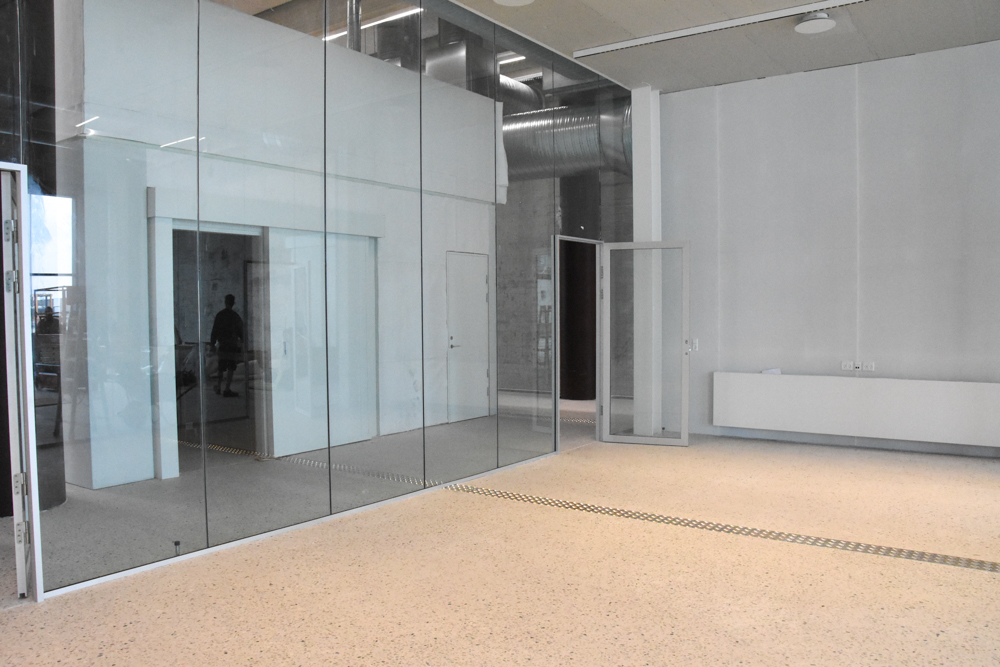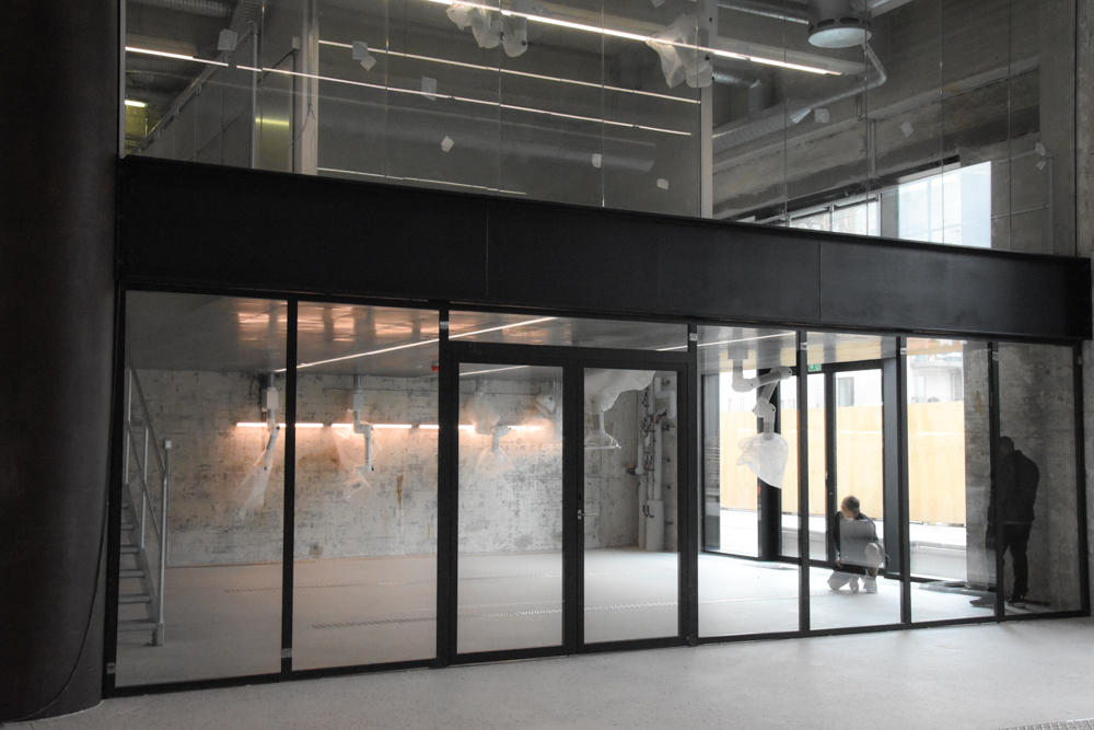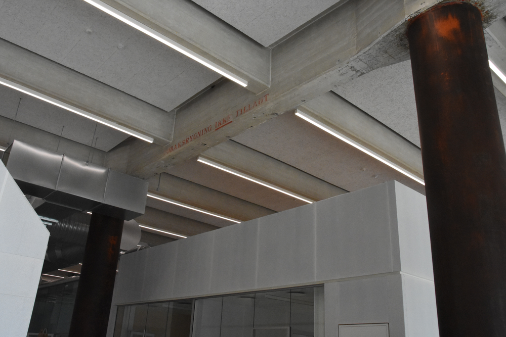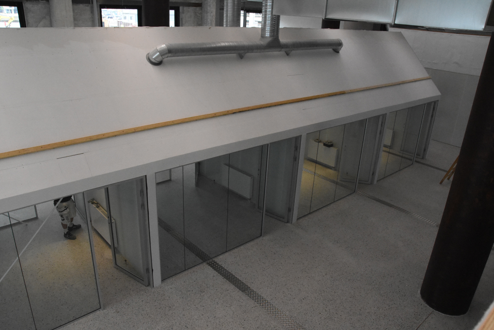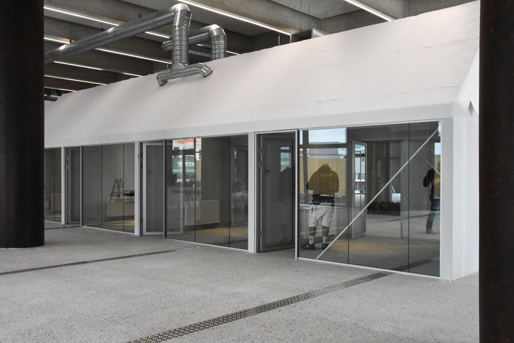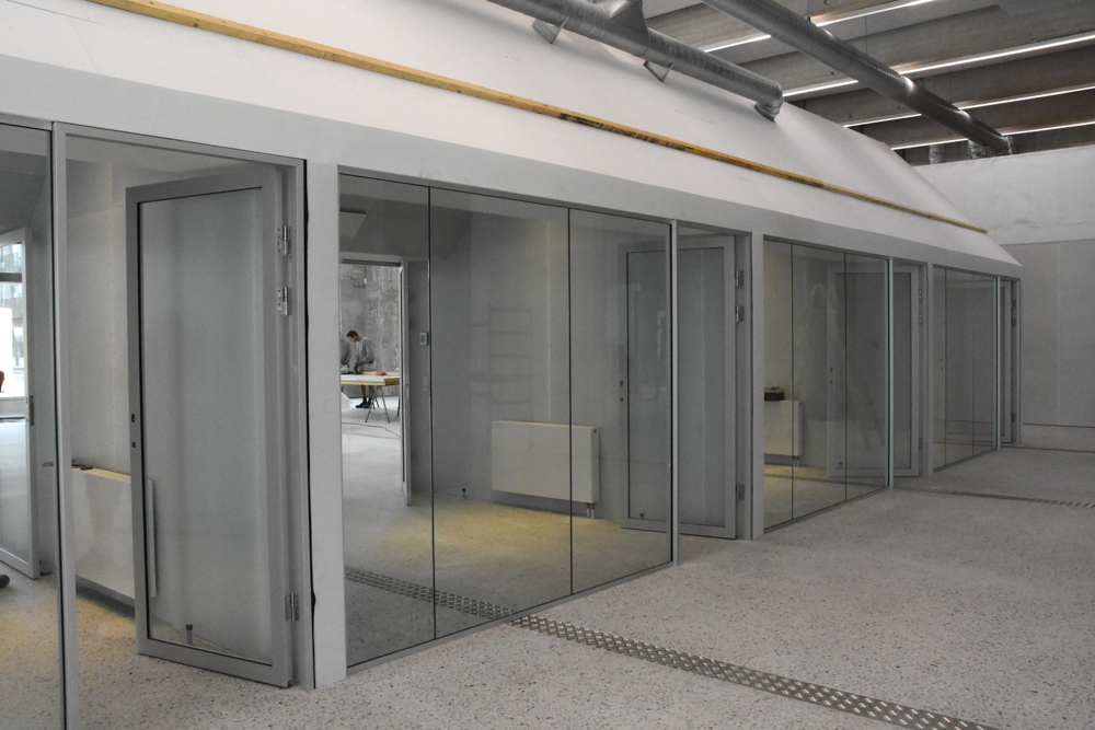 I den anden ende af lejemålet har vi etableret et indskudt dæk, og opbygget gasbetonvægge i et område med kontorrum, kantine, toiletter, lager samt modelværksted med glasvægge.